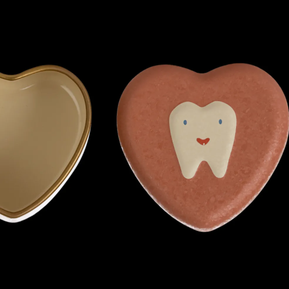 Cette boîte en métal et en forme de cœur est l’endroit idéal pour conserver les dents de lait et conserver des souvenirs d’enfance. La boîte est ornée d’une jolie dent en relief et d’une surface à l’allure craquelée, sur le couvercle.
