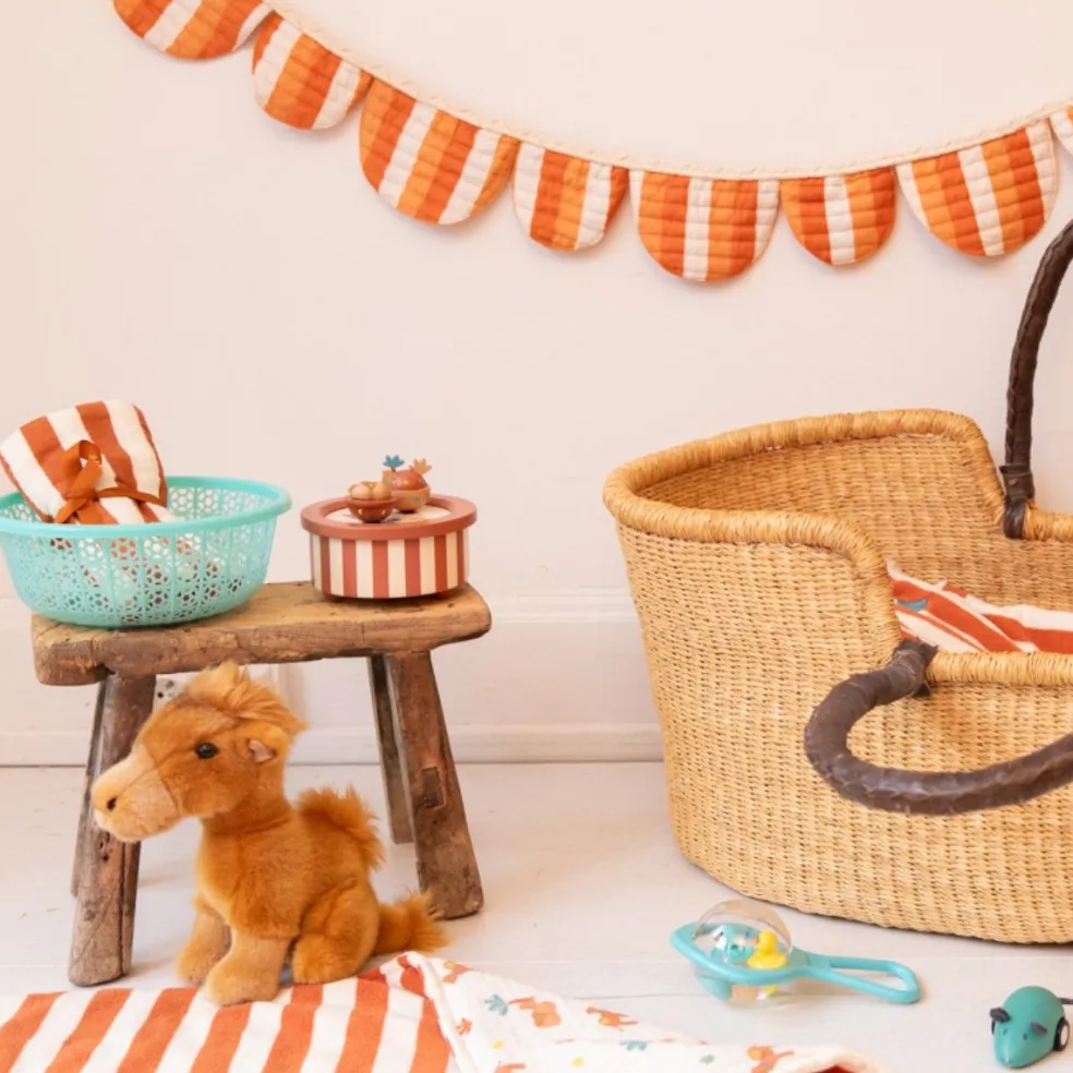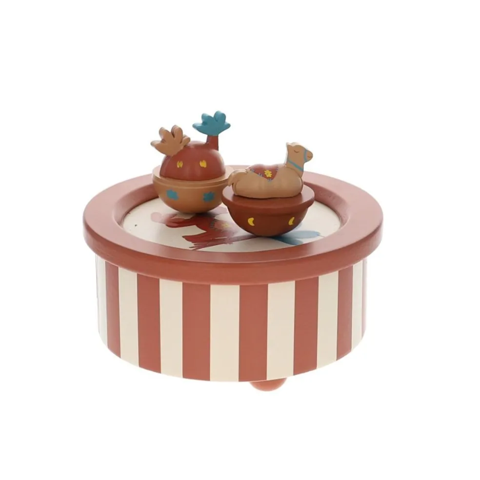Vous allez craquer et vous laisser transporter par la mélodie de cette belle boîte à musique et son imprimé rayé de la collection Sahara. Faites tourner la petite molette en dessous de la boîte, placez les deux petites figurines aimantées représentants un chameau et des palmiers et laissez bébé être bercé par la musique. Un magnifique objet de décoration à placer dans la chambre de votre bébé pour l’aider à s’endormir, le rassurer et calmer ses cauchemars et gros chagrins.