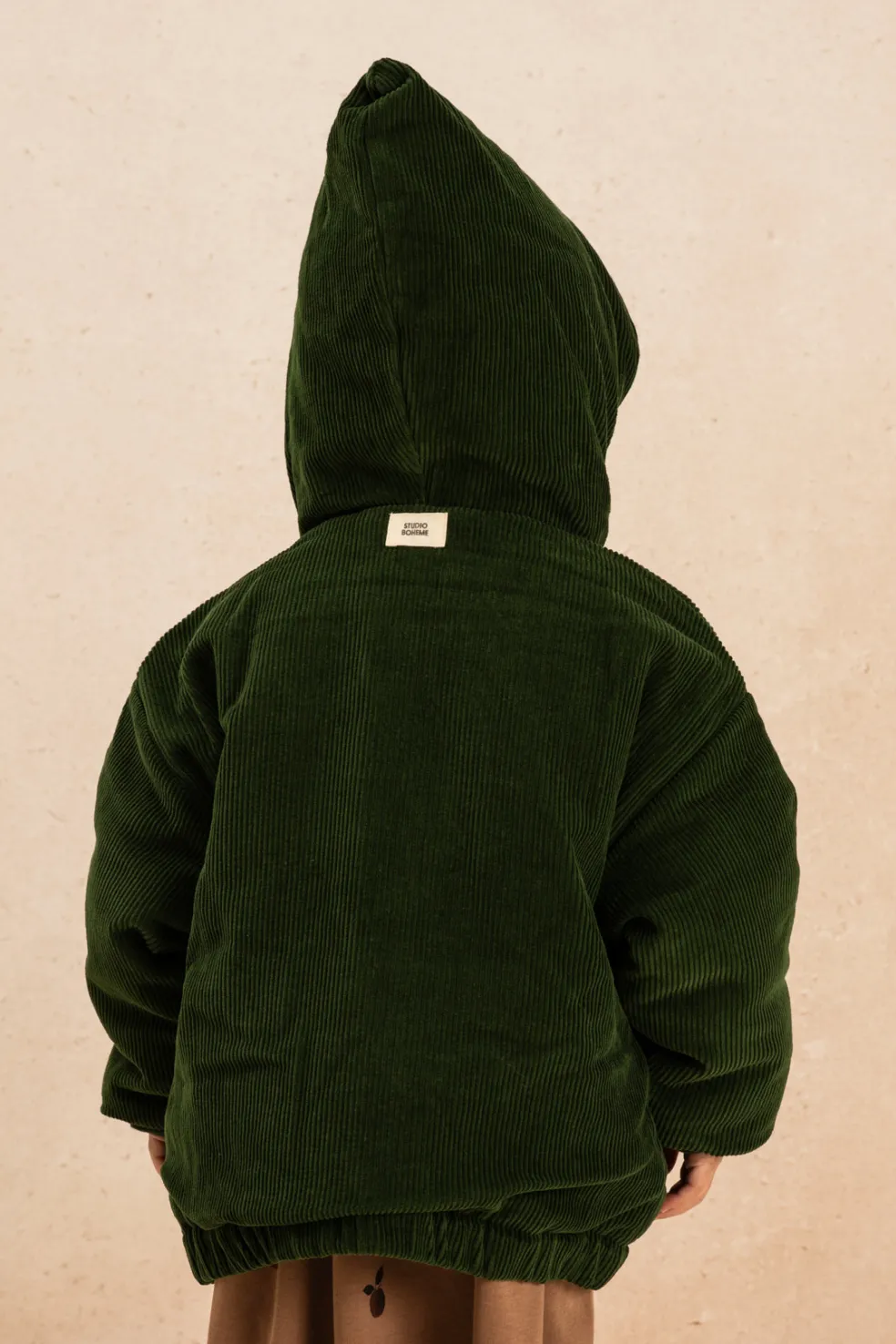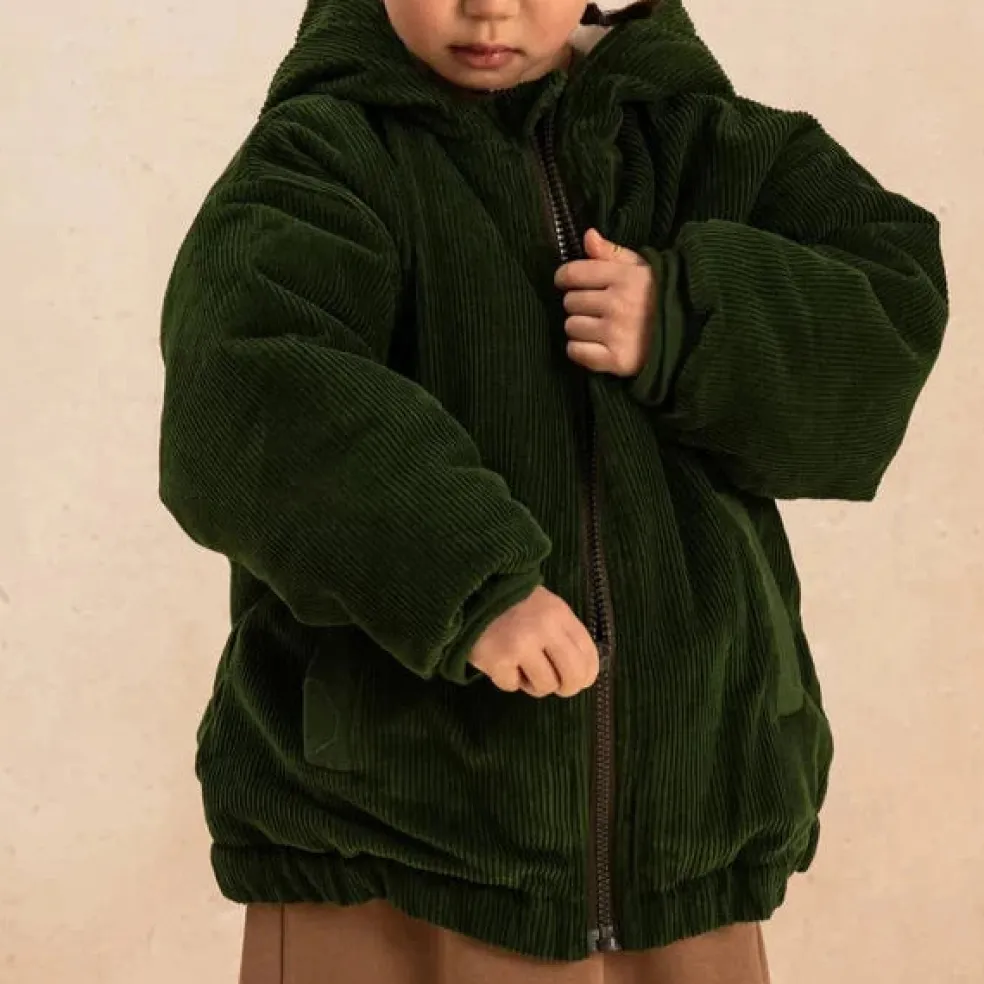Manteau mixte en velours côtelé de coton biologique à capuche pointue . Entièrement doublé, ce manteau est bien chaud et confortable grâce à sa doublure intérieure en jersey de coton pima biologique.