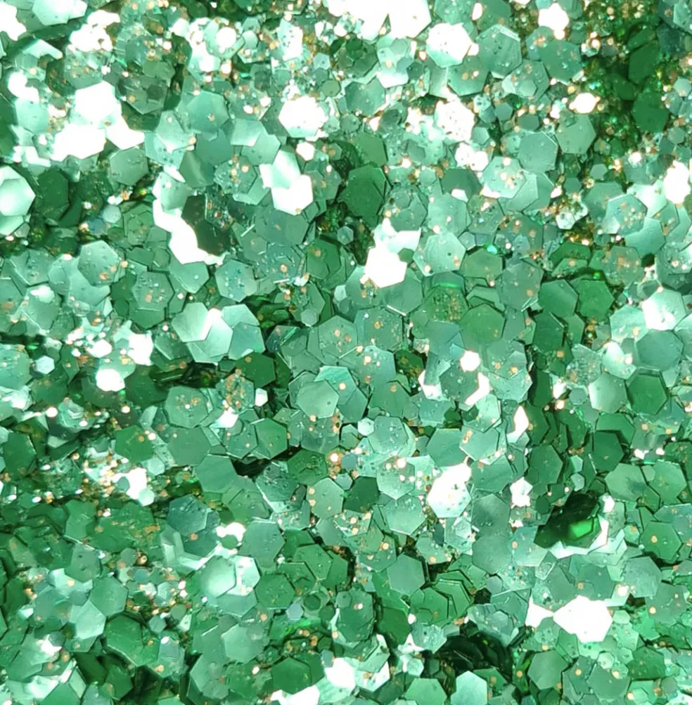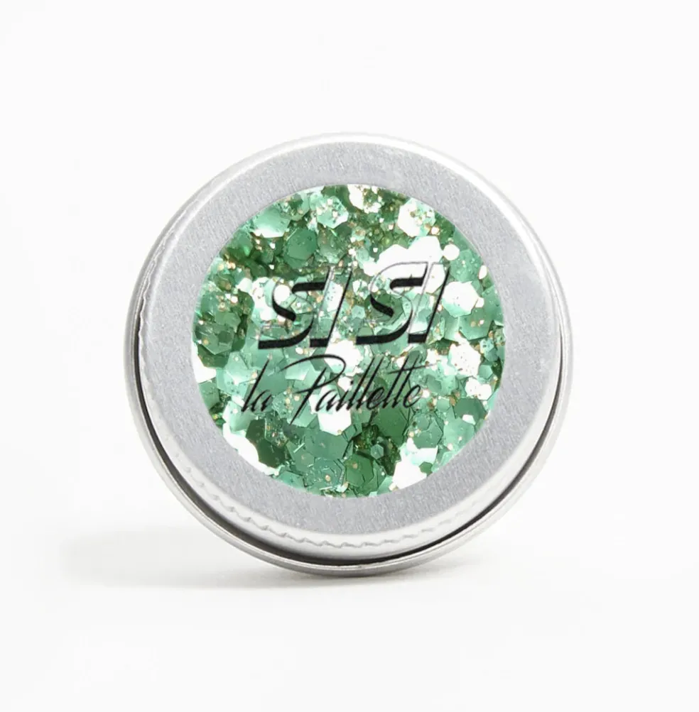 Un mélange de paillettes à base de plantes « Poison Simone » aux couleurs vertes et or, et de toutes les tailles pour toujours plus de brillance !