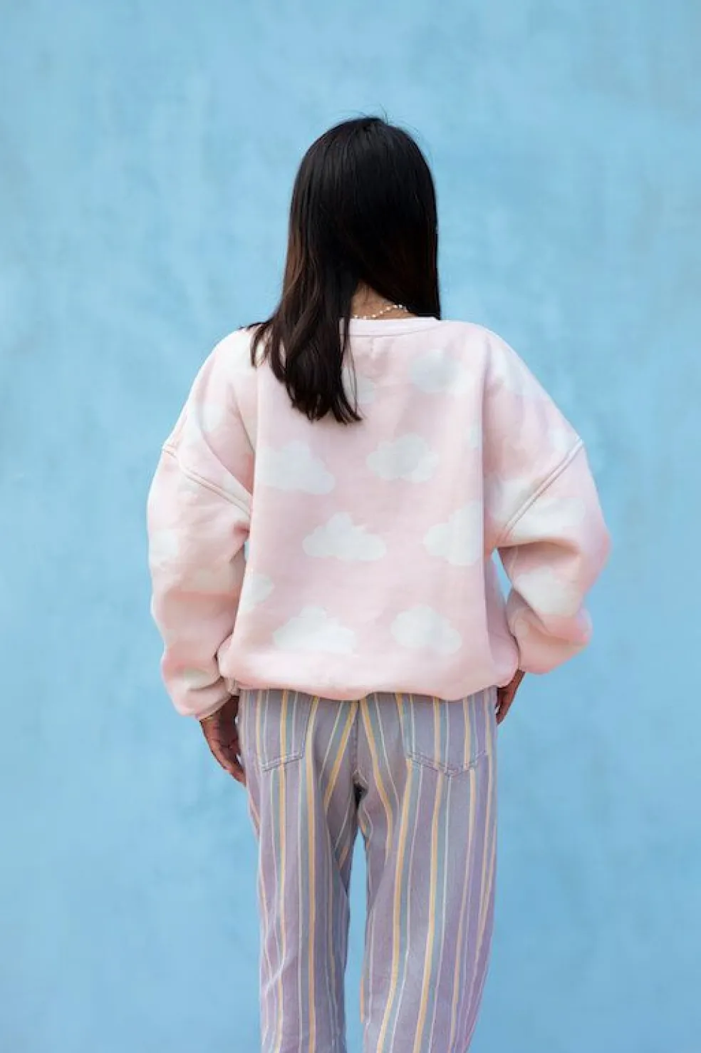 Coupe oversize légèrement crop, avec emmanchure basse pour un look rétro-contemporain. Le motif Trio de Nuages est entièrement dessiné à la main par la créatrice Ayuna.