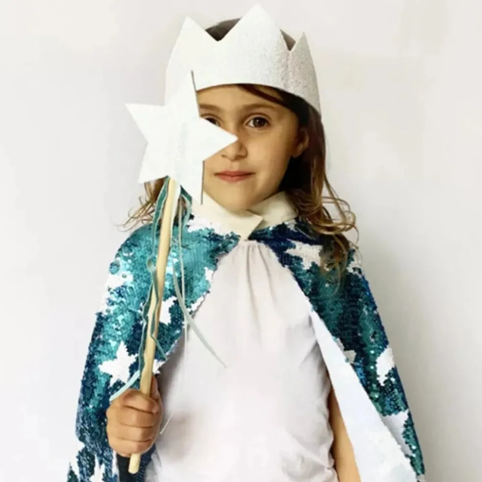 La baguette magique en bois, faite de feutrine et d’un tissu pailleté, elle est dotée de deux rubans pailletés et deux rubans satin.