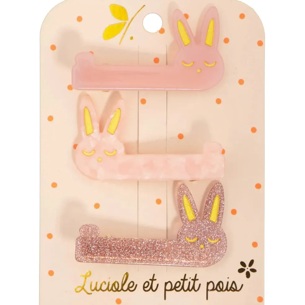 Nouvelles Barrettes en nacre Luciole et Petit Pois. 3 petits lapins avec des finitions en nacre, uni et glitter. Ces barrettes apportent une variété de styles à chaque coiffure tout en soutenant notre planète.Ces barrettes sont fabriquées avec soin à partir d’une matière végétale biodégradable et respectueuse de l’environnement.