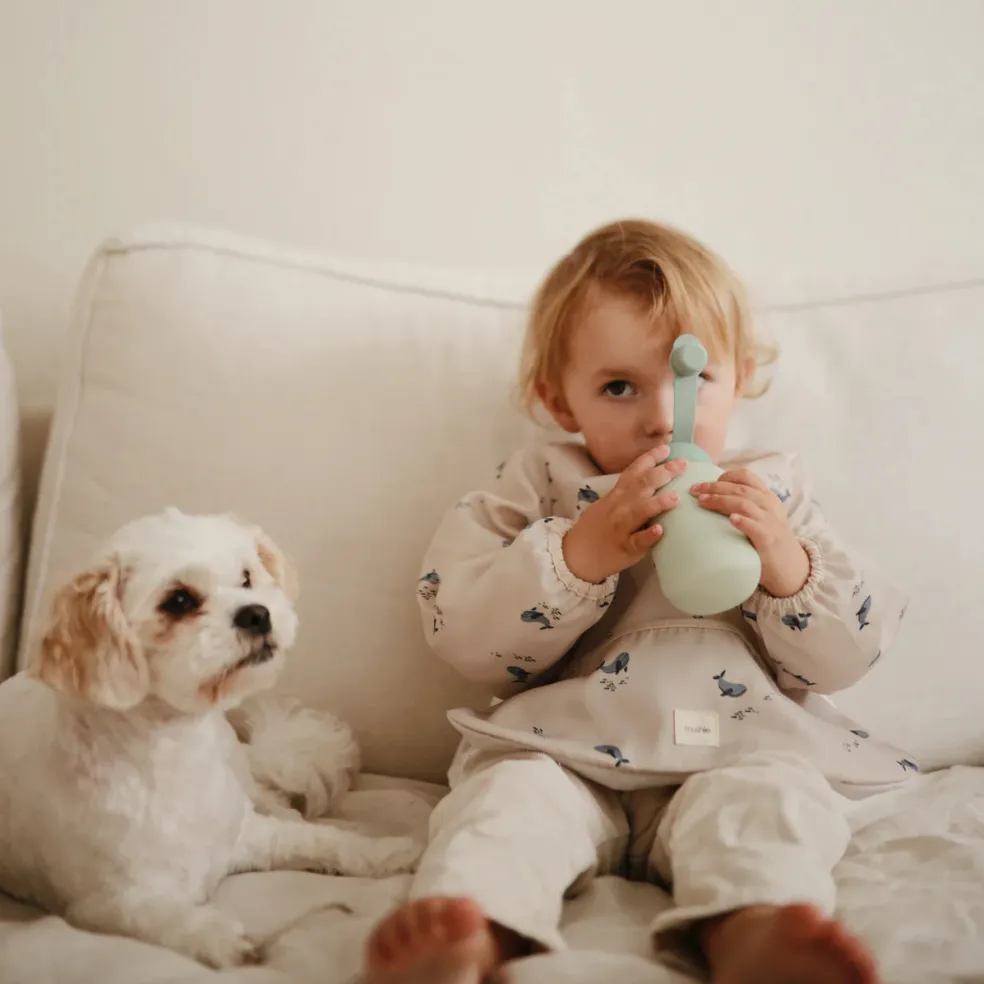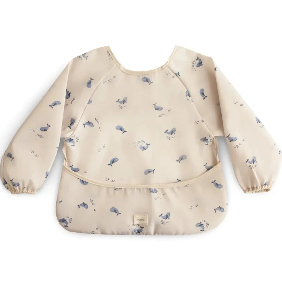 Le bavoir imperméable doté de manches longues est idéal pour protéger les vêtements au moment des repas. On craque pour son imprimé Baleines.