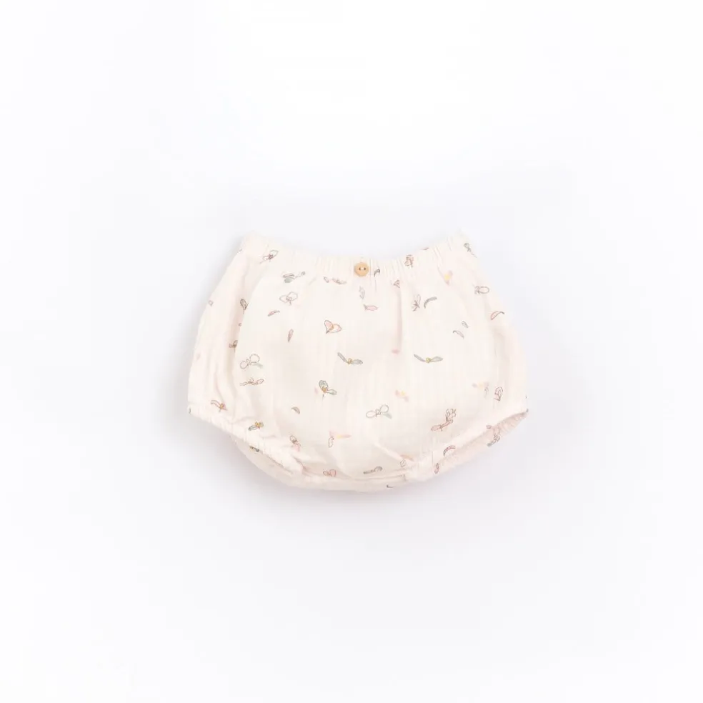 - Elastiques à la taille et aux jambes, un bouton décoratif en bois.