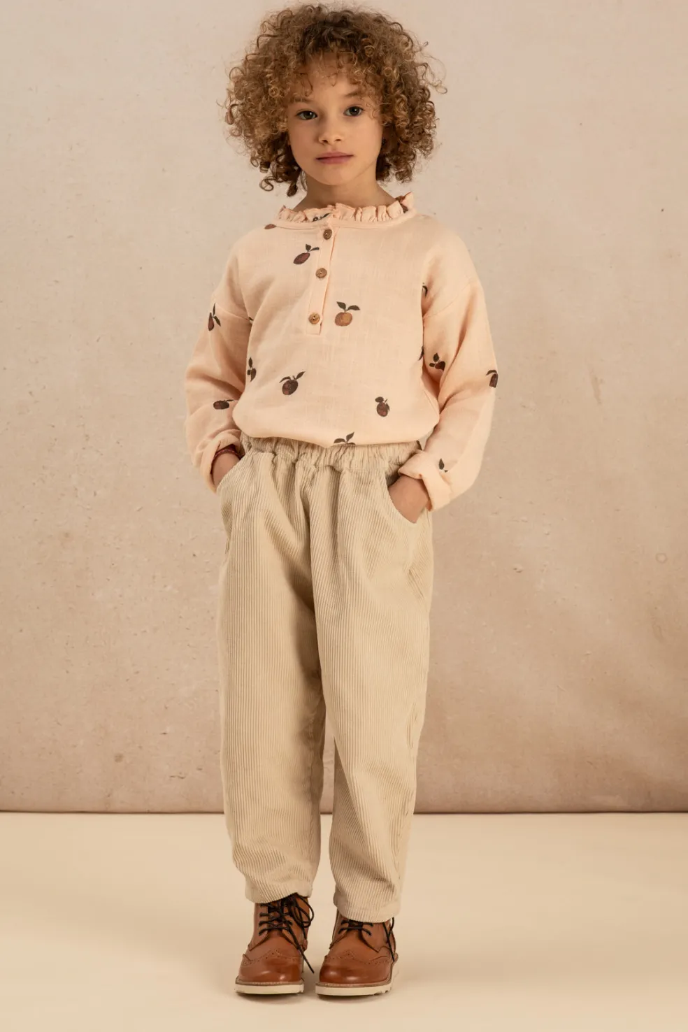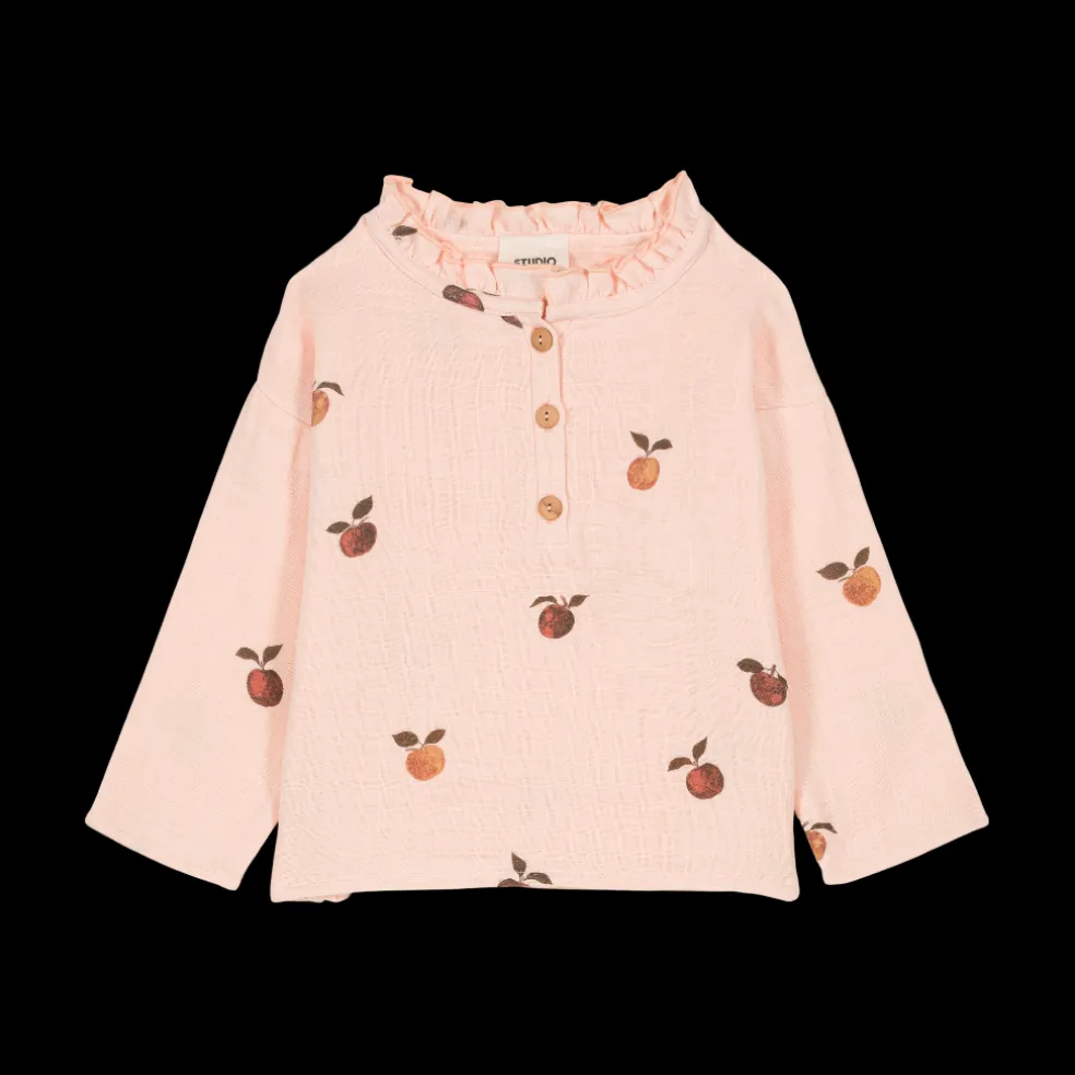 Blouse rose clair imprimée pommes manches longues en gaze de coton. On adore ses jolis détails au col et les jolis imprimés !