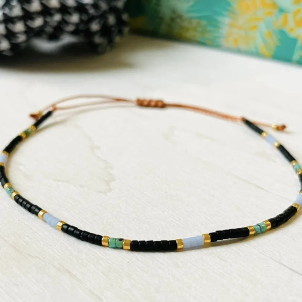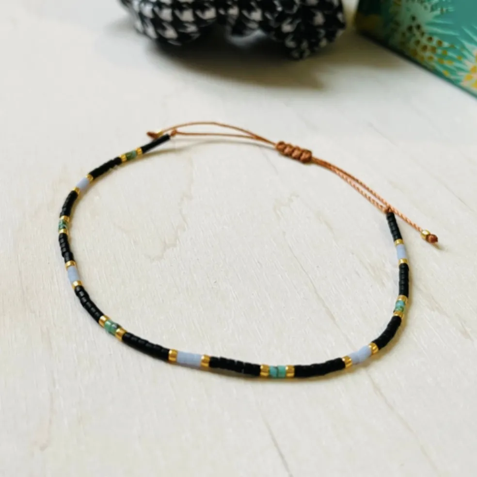 Joli bracelet fin et réglable en perles Miyuki doré vert d’eau et rose. On craque pour les créations de cette jeune créatrice française.