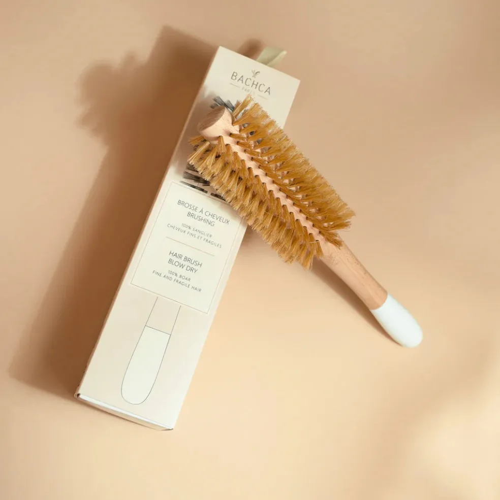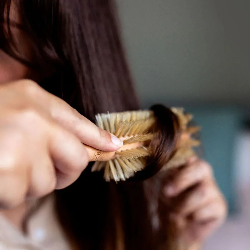 Brosse brushing ronde en bois naturel, idéale pour le brushing et la mise en forme des cheveux.