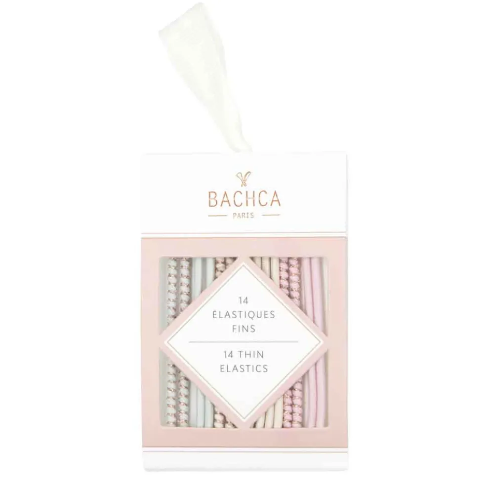 Déclinés dans les tons pastels et ornés d’un fil lurex cuivré, les élastiques Bachca peuvent être utilisés en toutes circonstances.