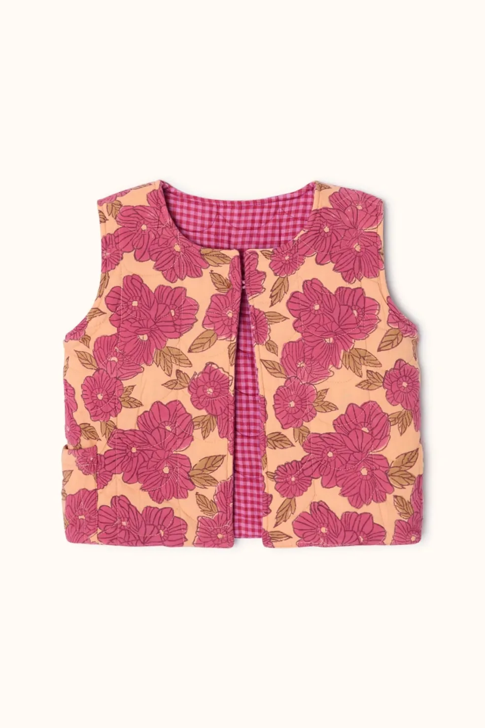 Le gilet Sakaru en khadi fuchsia sera parfait pour ajouter une touche de pep’s aux tenues des filles. Réversible, elles pourront le porter une fois côté fleuri, une fois côté vichy avec de délicates broderies. Il viendra s’adapter à toutes les envies de vos minis, à porter à l’infini avec toutes les tenues !