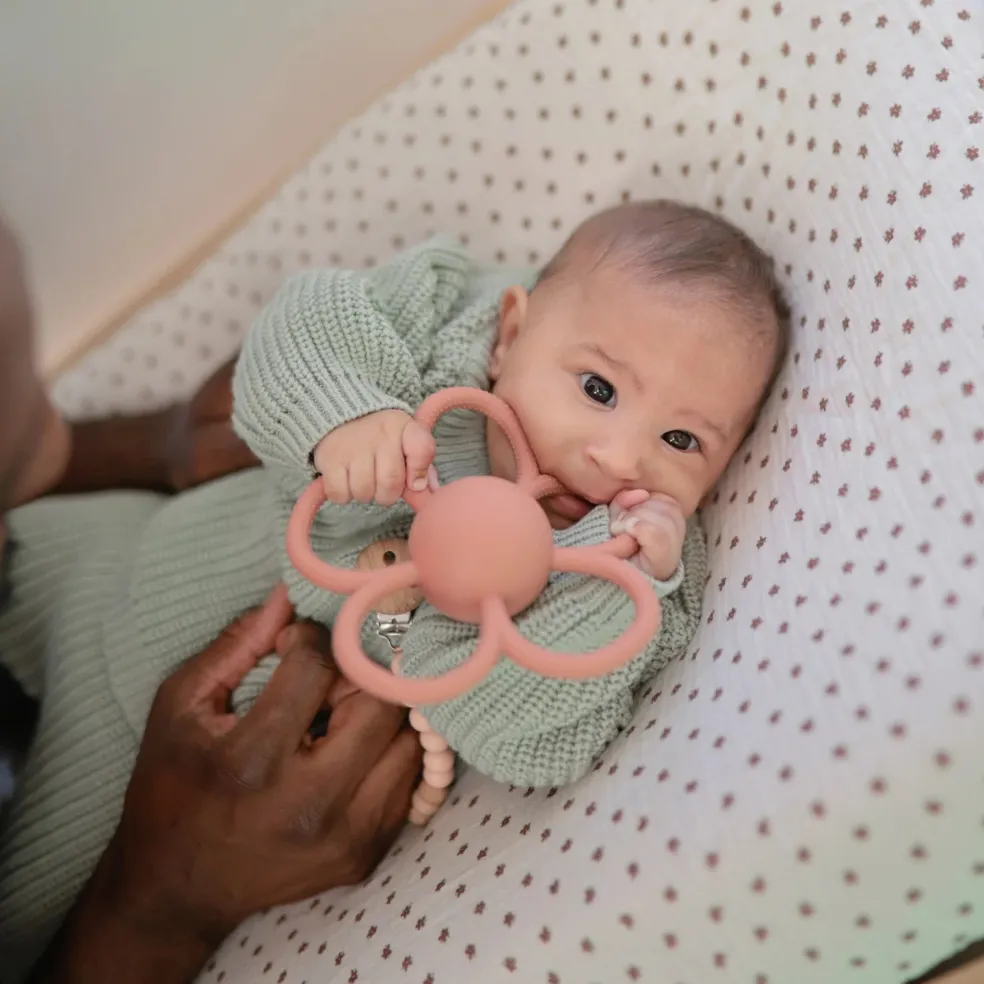 Ce joli hochet de dentition Fleur de Mushie est idéal à la fois pour apaiser les gencives et amuser bébé! On adore son design en forme de fleur, et facile de préhension. Au centre, se trouve un grelot pour développer l’ouïe de votre tout-petit. Fabriqué à partir de silicone de qualité alimentaire 100 % non toxique, il est sans danger pour votre bébé.