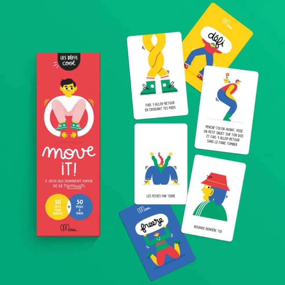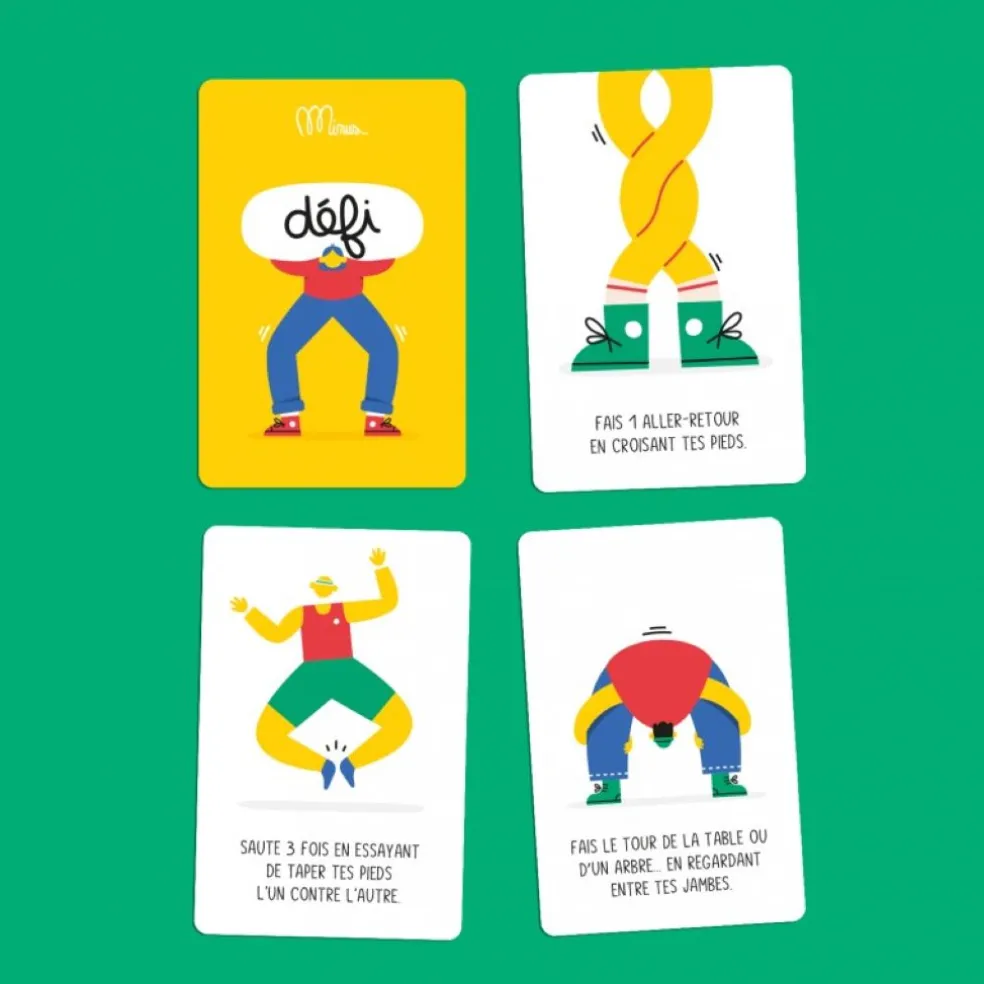 → 50 cartes défi : Ramper sans s’aider de ses pieds, avancer en regardant entre ses jambes, écrire son prénom avec ses fesses… Lancez-leur des défis amusants et tout en mouvement !