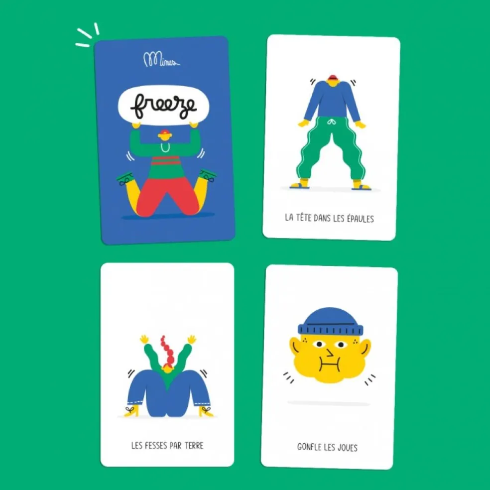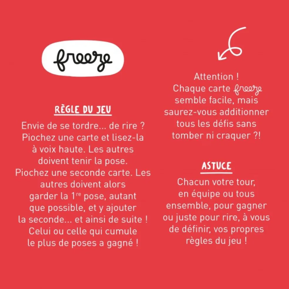 → 50 cartes freeze : Un bras derrière la tête, une jambe en l’air, une main au sol… Ils vont cumuler des poses et se contorsionner. Attention à ne pas craquer en premier !