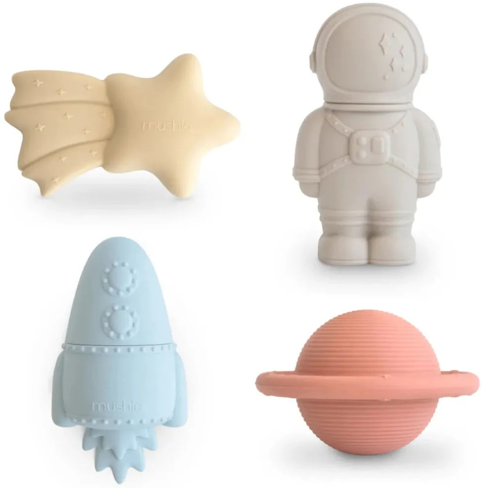 Faites sensation à l’heure du bain avec l’ensemble de jeu pour le bain spatial qui comprend une planète, un astronaute, une fusée et une étoile filante.