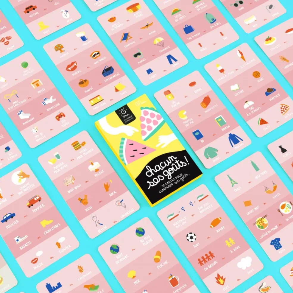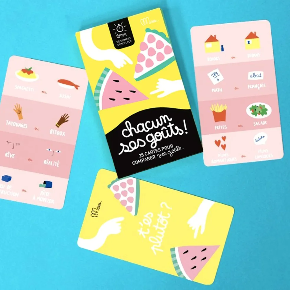 » T’es plutôt bain ou douche ? « . Les goûts et les couleurs, ça ne se discute pas ! Ah bon ?! Voici 25 cartes pour comparer vos goûts, découvrir vos points communs et vous étonner de vos différences. Que vous soyez en famille ou entre amis, une seule certitude : vous passerez au moins 5 min d’un bon moment drôle et complice !