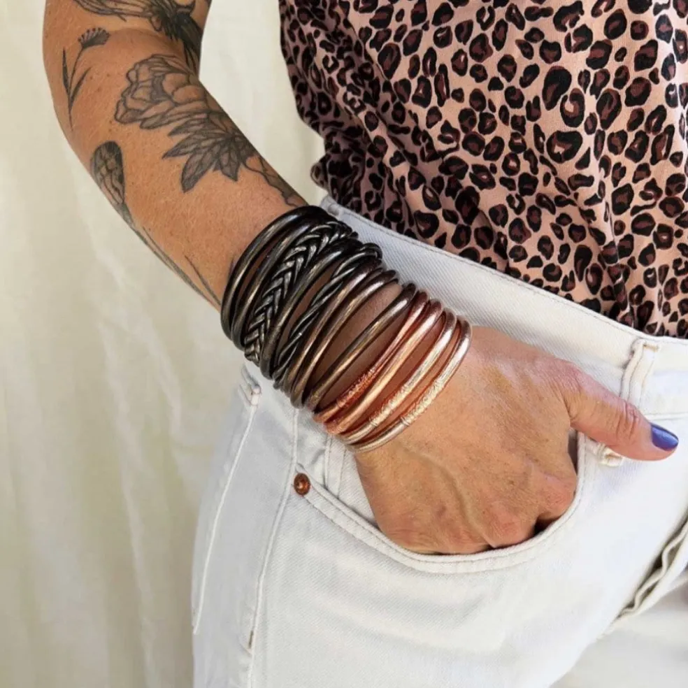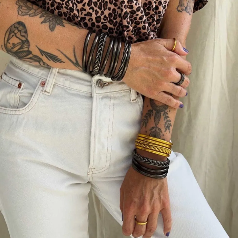 - Un bracelet bouddhiste constitué d’un jonc souple et transparent rempli à la feuille d’or ou d’argent