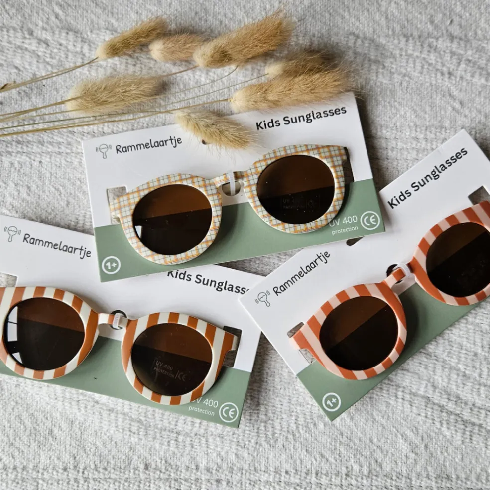 Lunettes de soleil pour enfants avec protection UV400. Forme unisexe et motif carreaux beige et ocre.