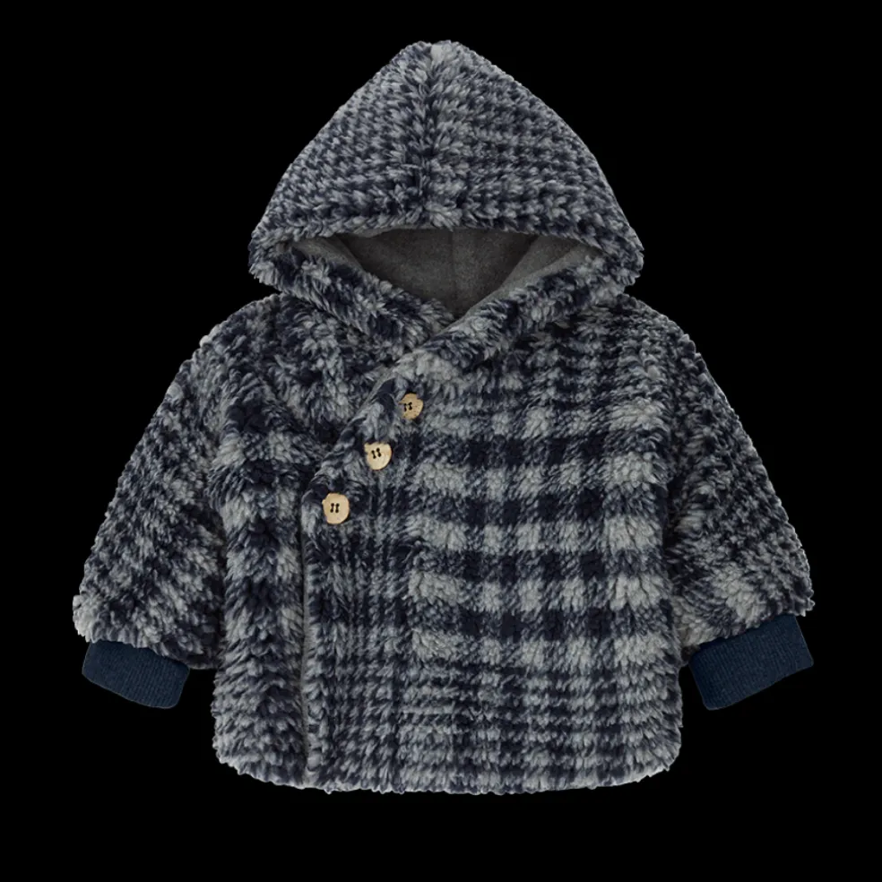 Redécouvrez le manteau Ethan avec un nouveau motif carreaux en gris et marine. Poignets ressérés pour rester bien au chaud. Jolis boutons en bois sur le côté.
