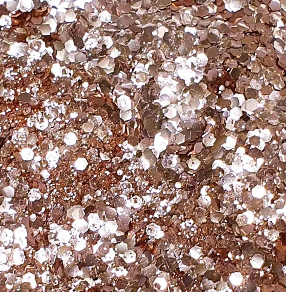 Paillettes Tchin Tchin de couleur or rose. Il faut se munir du baume au beurre de karité. Appliquez le baume à l’aide d’un pinceau puis déposez-y les paillettes puis le tour est joué ! Les paillettes s’appliquent sur le visage, corps, cheveux, ongles et loisirs créatifs.