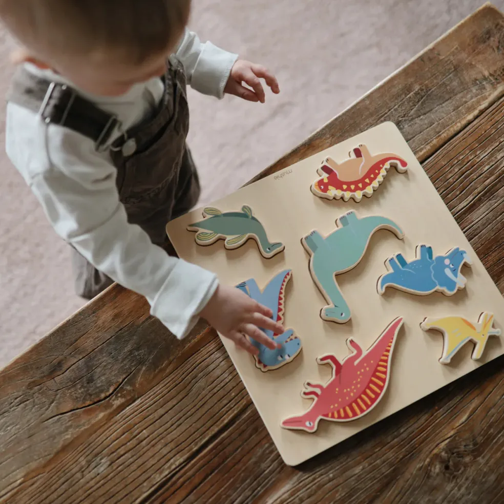 Faites découvrir aux enfants les merveilles de l’univers avec le puzzle dino en bois de Mushie.
