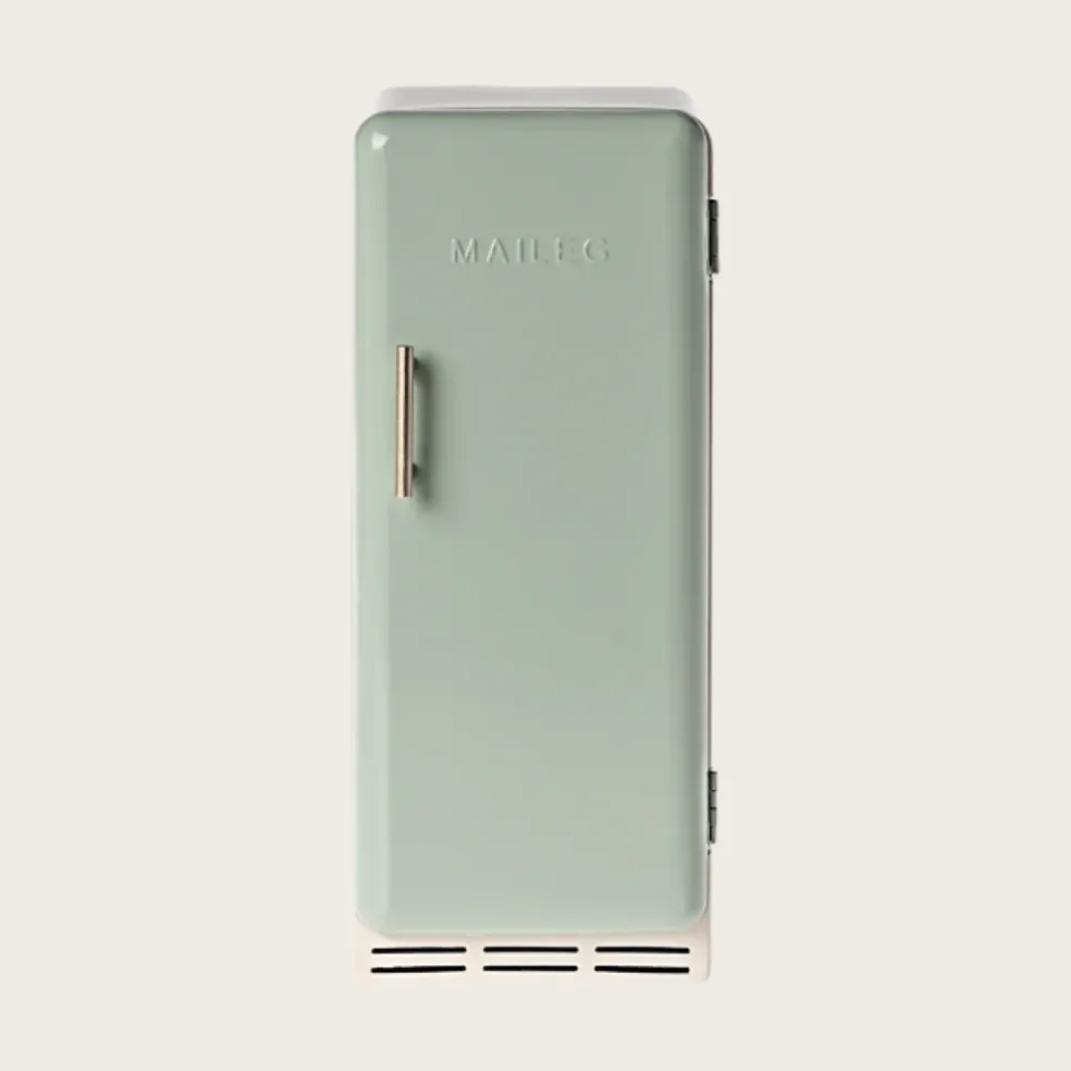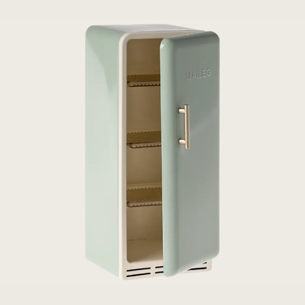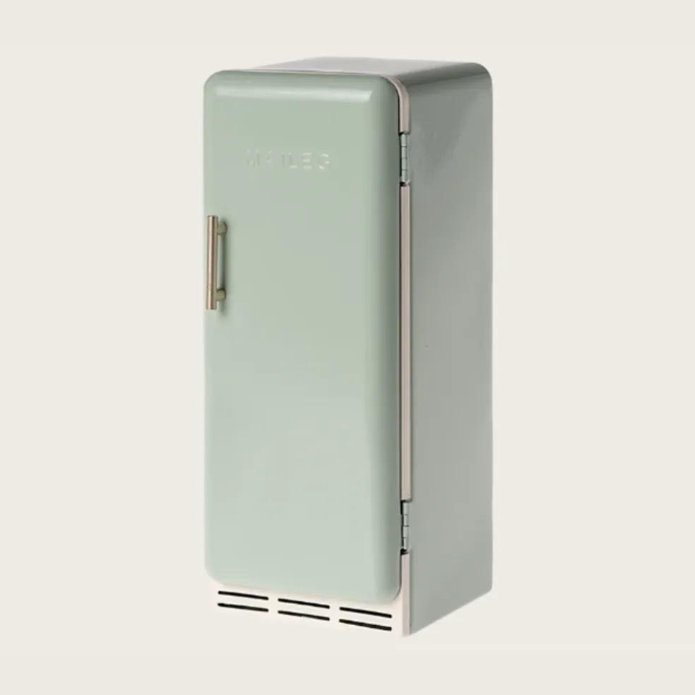 Un réfrigérateur vintage, en métal, qui s’intègre parfaitement au maison des souris. Il possède une fermeture magnétique et des étagères givrées à l’intérieur.