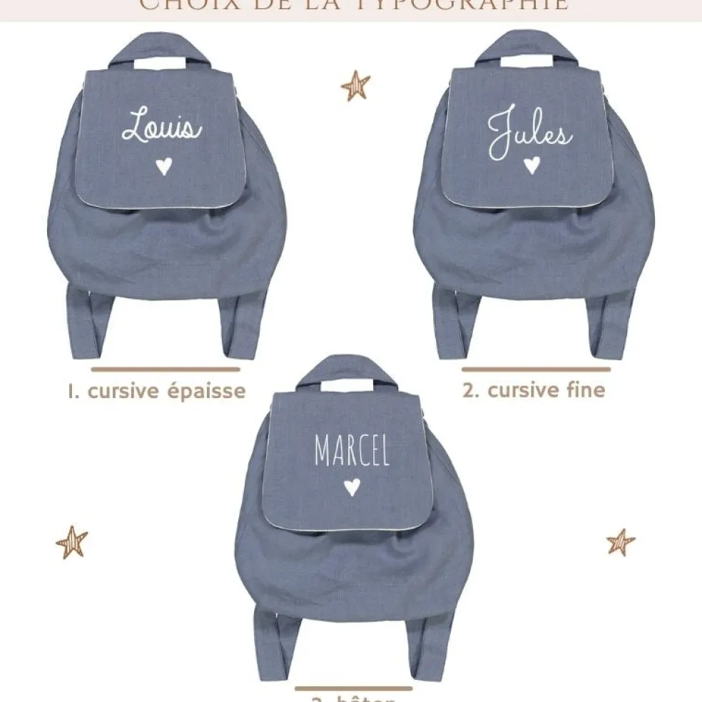 Sac à dos en lin personnalisable avec le prénom de votre enfant. Pratique, il a une ouverture scratch idéale pour les plus petits. Un très joli sac à dos dans lequel on peut transporter un goûter, des affaires de rechanges, une tétine ou un doudou.