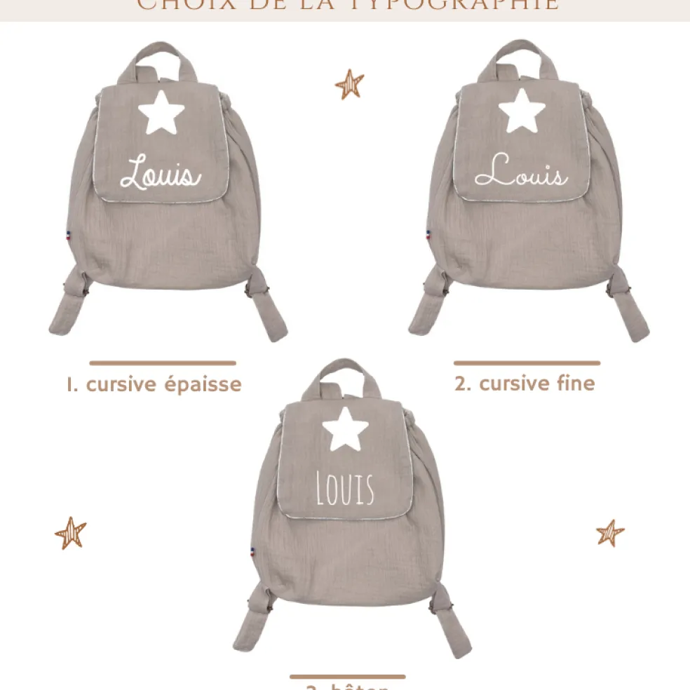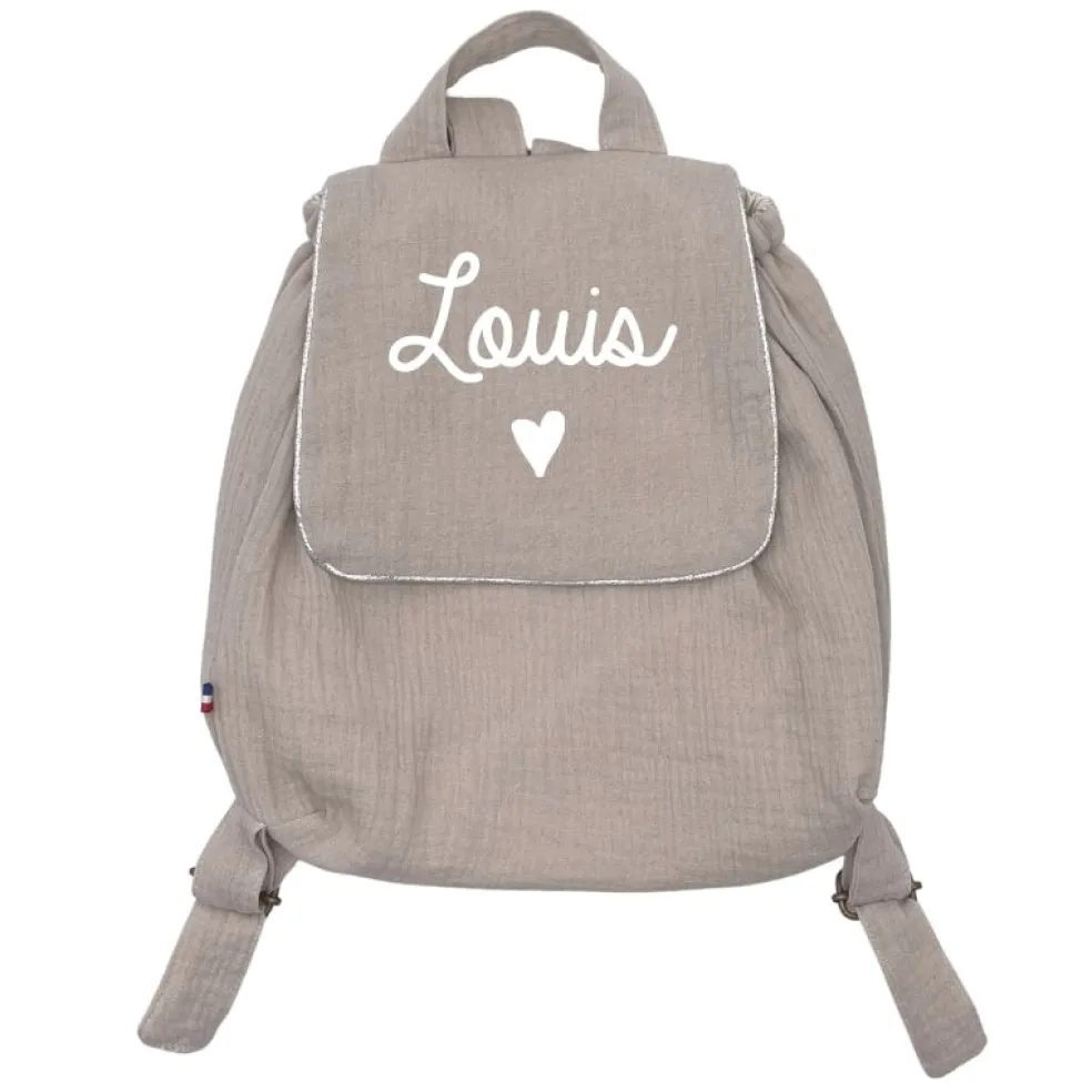 Sac à dos en double gaze de coton personnalisable avec le prénom de votre enfant. Pratique, il a une ouverture scratch idéale pour les plus petits. Un très joli sac à dos dans lequel on peut transporter un goûter, des affaires de rechanges, une tétine ou un doudou.