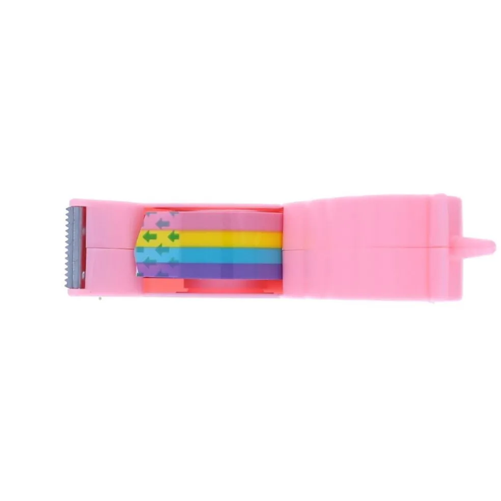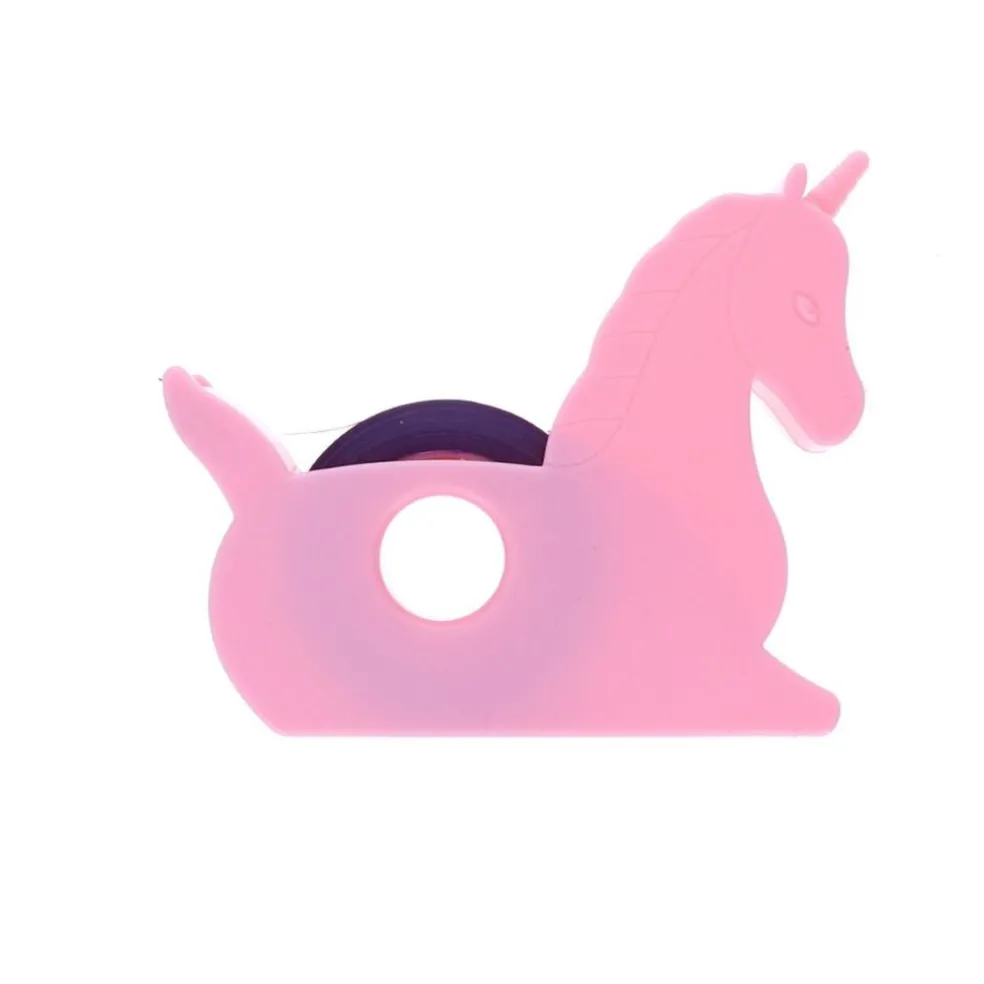 Un dévidoir de ruban adhésif rose bonbon en forme de licorne.