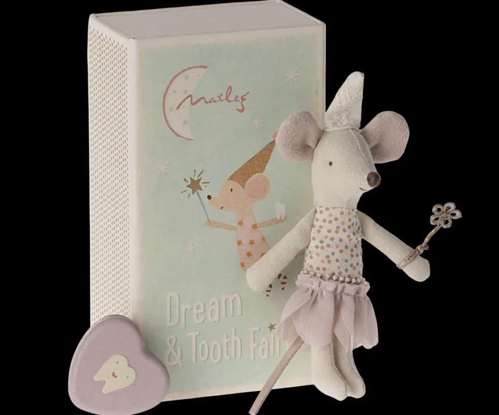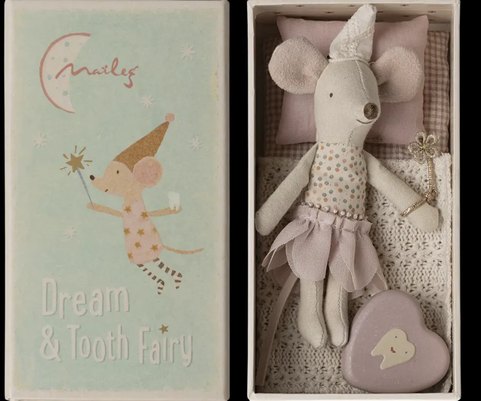 La nuit, la petite souris fée ramasse les dents et apporte un cadeau ou une pièce, pendant que tu fais de beaux rêves. La journée elle se repose dans le doux linge de sa boîte assortie; qui comprend aussi une boîte à dents. Les tissus peuvent varier.
