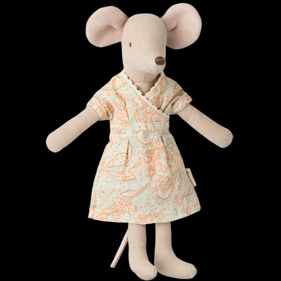 Cette souris s’adapte aux meubles et accessoires de taille souris. Les vêtements de taille maman/papa conviennent à cette souris.