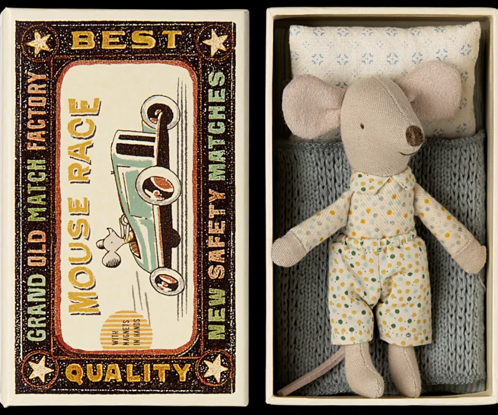 Nouvelle souris petit frère en pyjama dans sa boite lit . Jolie couverture en laine et oreiller.
