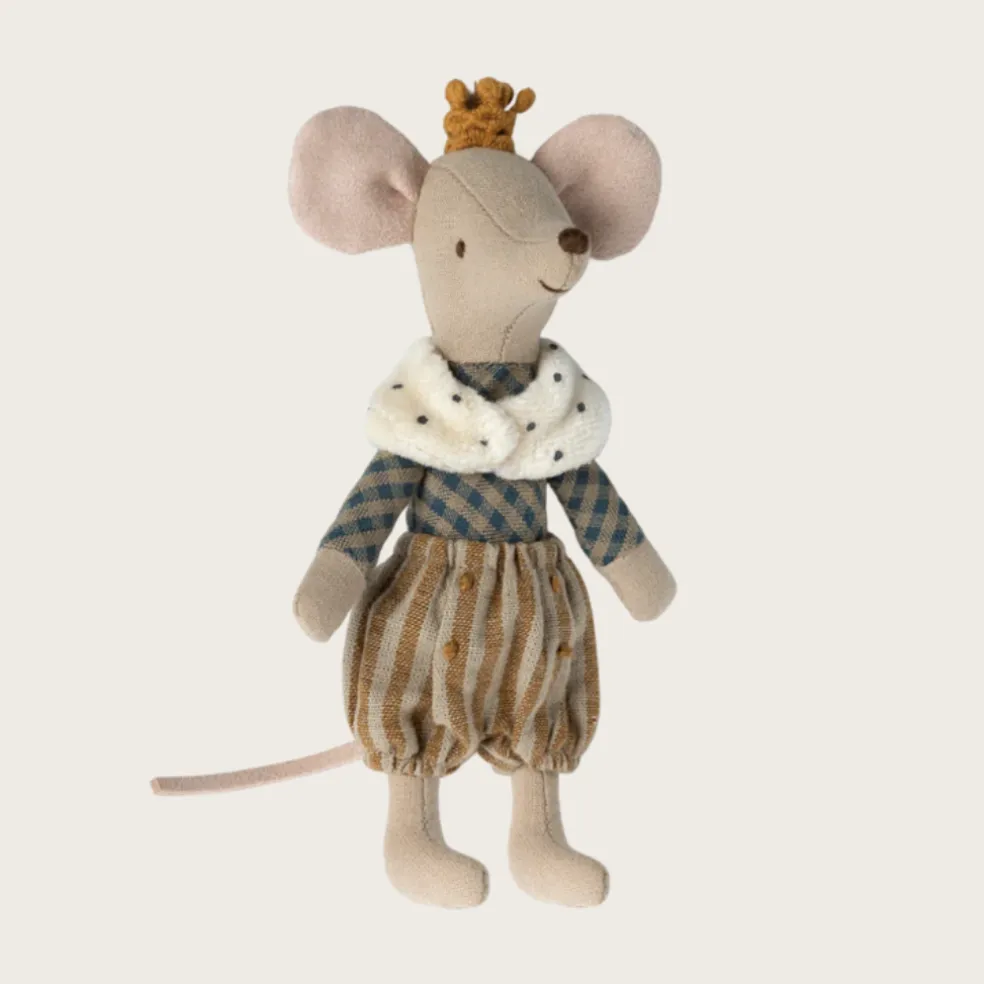 Une vraie souris prince dans une taille grand frère. Il est vêtu de ses plus beaux vêtements avec de beaux détails et une couronne dorée.