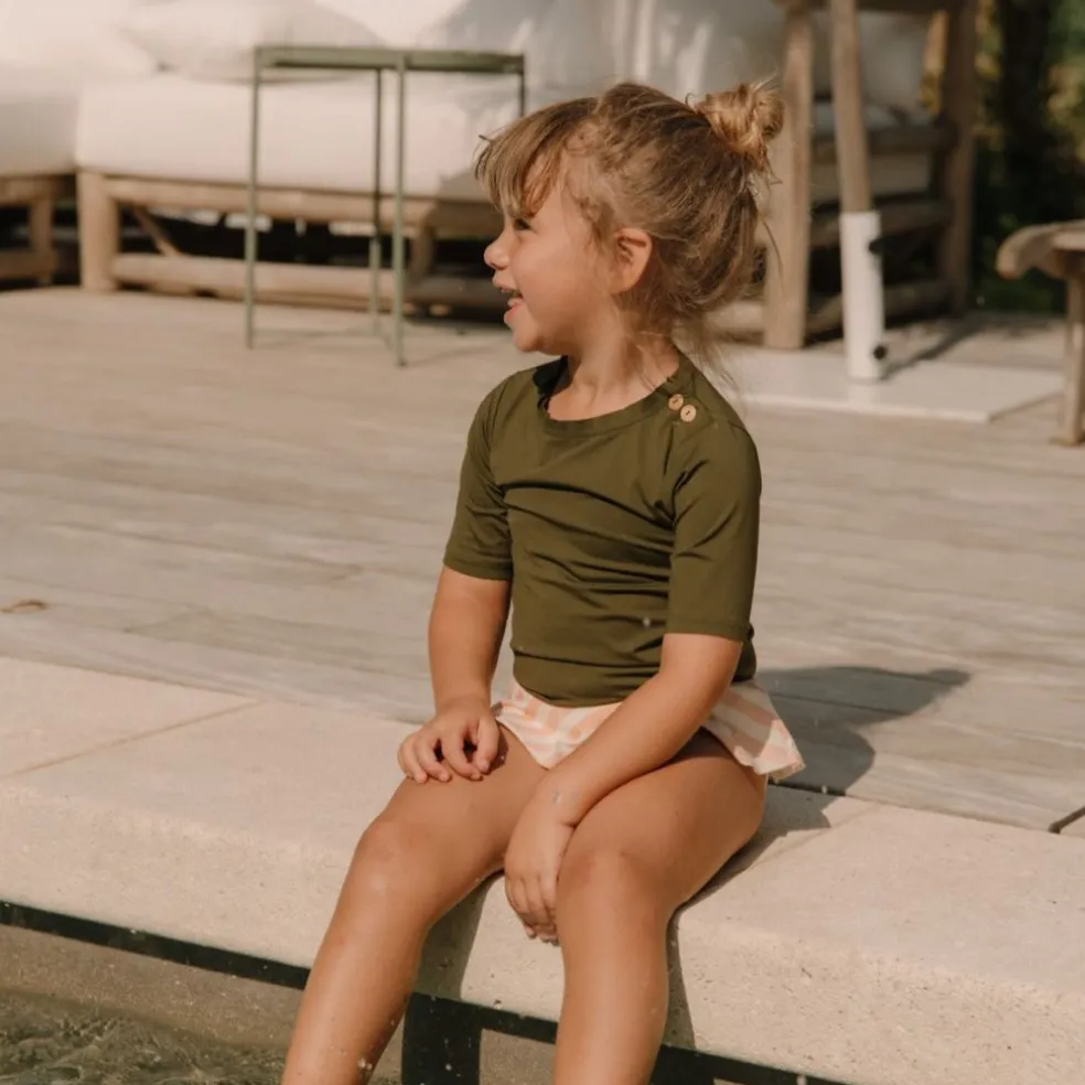 Respirant et confortable, avec un toucher peau de pêche. Sèche vite. Boutons en bois sur l’épaule pour faciliter l’enfilage