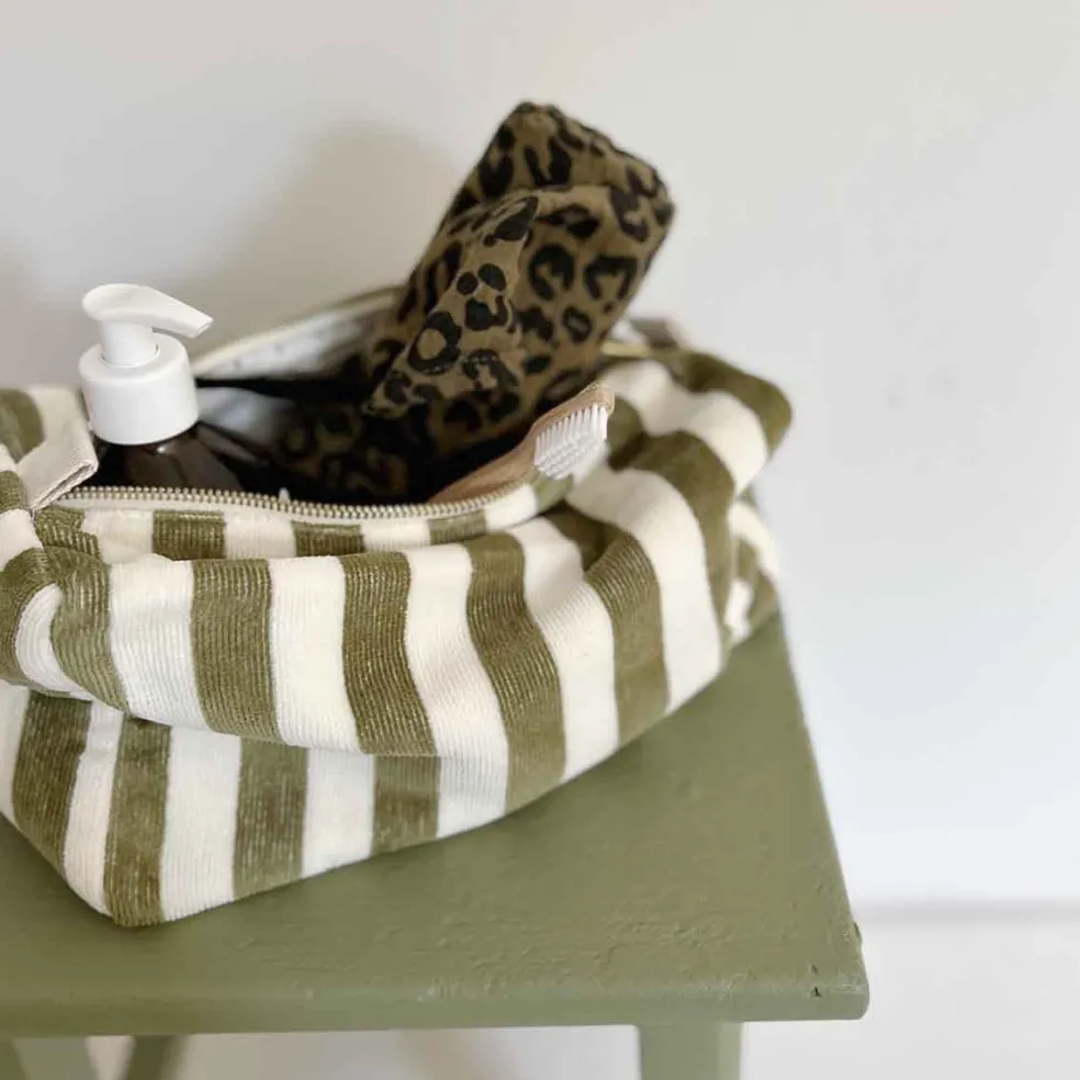 Trousse de toilette Rose in April, motif rayures kaki.Parfaite pour emporter le nécessaire de toilette, le temps d’un week-end, ou d’un petit voyage !
